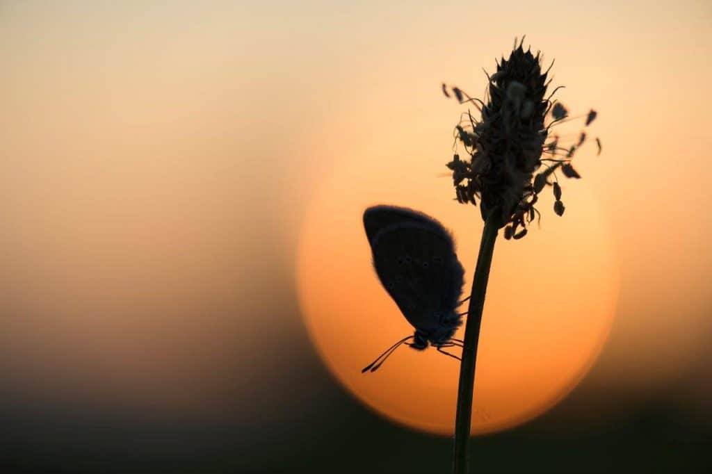 Wie het allemaal wat kleiner ziet, kan ‘het mooiste licht’ ook toepassen bij macrofotografie. De vleugels van vlinders en libellen zijn vaak doorschijnend en zullen in tegenlicht opflakkeren. Hangt er ook nog wat dauw op hun tengere vlerken dan is het pas echt feest. De druppels op hun vleugels of op de vegetatie rondom het onderwerp creëren prachtige lichtvlekjes wanneer je ze met een groot diafragma (bv. f/2.8) fotografeert. Dit wordt ook wel bokeh genoemd. Omdat de scherptediepte bij f/2.8 erg beperkt is, vallen de dauwdruppels buiten het scherpstelvlak en worden ze als onscherpe cirkels afbeeld. Er ontstaat een levendig bokeh van wazige druppeltjes die je groter en kleiner kunt maken door te spelen met het diafragma. Uiteraard moet je voor dergelijke foto’s wat ruimte laten rondom het onderwerp zodat je ook een deel van de omgeving kunt laten zien. Als je te veel inzoomt, blijft er immers weinig over van de dauwdruppels op de vegetatie.