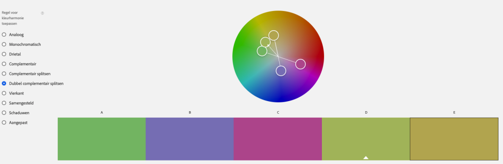 Als ik vertrek vanuit de groene kleur als basis, kan ik bij verschillende kleurharmonieën kijken welke kleuren er goed bij passen. Het schema dubbel complementair splitsen toont dat de hier gebruikte kleuren mooi samen gaan. Alleen is het blauw in het schema iets paarser. Met deze informatie heb ik een goede basis om mijn kleuraanpassingen te doen. Door het blauw iets paarser te maken en het paars meer naar het blauw te halen krijg ik een mooi uitgebalanceerd kleurenpalet.
