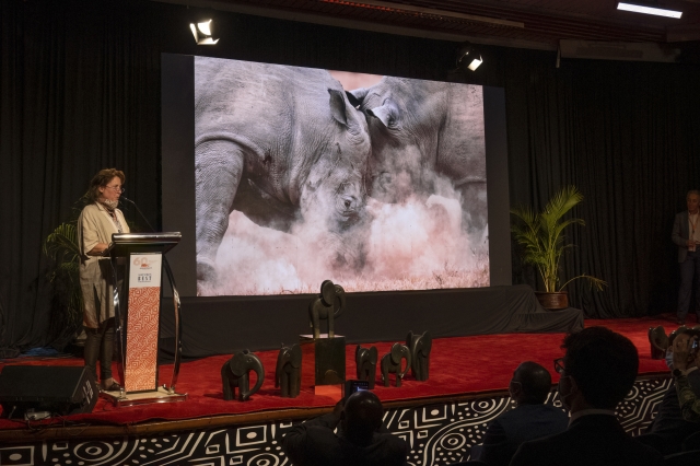 Fotografen kunnen hun boodschap overbrengen via lezingen – Ingrid Vekemans over natuurbescherming, Mkapa Awards Ceremony, Nairobi, oktober 2021.
